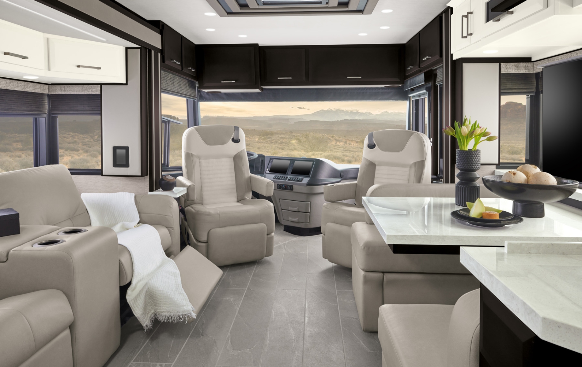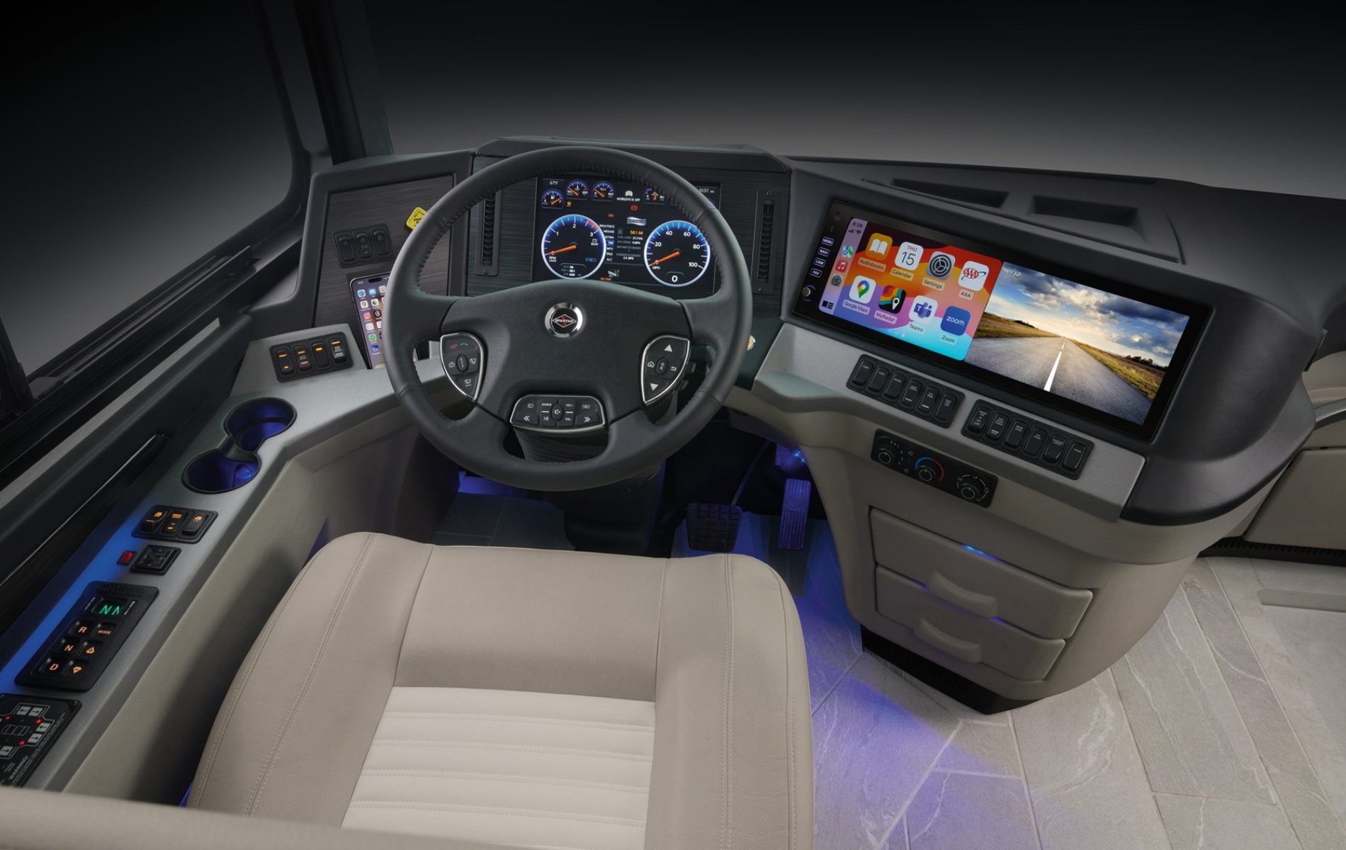 The cockpit is equipped with an ultra-wide 20-inch infotainment screen supporting Apple CarPlay and the Nav-N-Go navigation system, ensuring seamless connectivity and intuitive navigation. A new temperature monitor for the water bay has been integrated into the Silverleaf system, providing real-time updates. The in-dash Xite monitors are now housed under a single piece of glass, offering a sleeker appearance. For those seeking enhanced connectivity, Starlink Internet is available as an option.